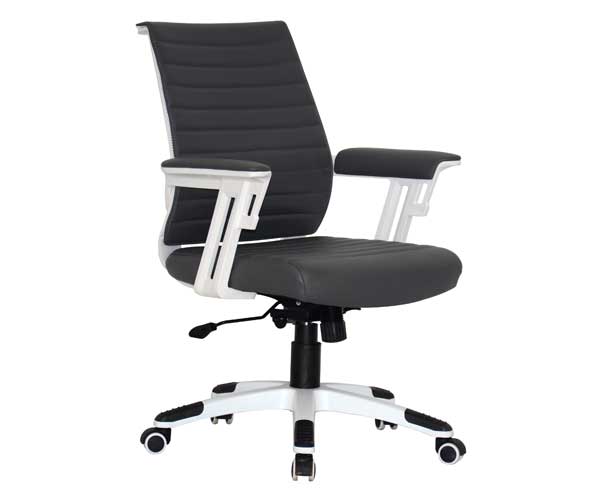 The Wall Street Mid-Back Chair in dark grey offers a blend of comfort and style for the modern office. It includes a 2-lever executive swivel and tilt mechanism and gas height adjustment. The white frame complemented by dark grey pleather upholstery provides a sleek and professional look, suitable for various office environments.
